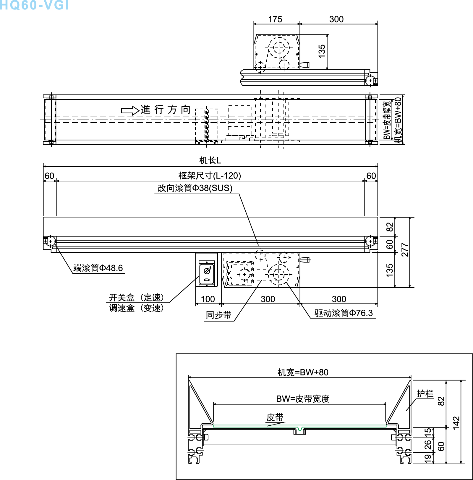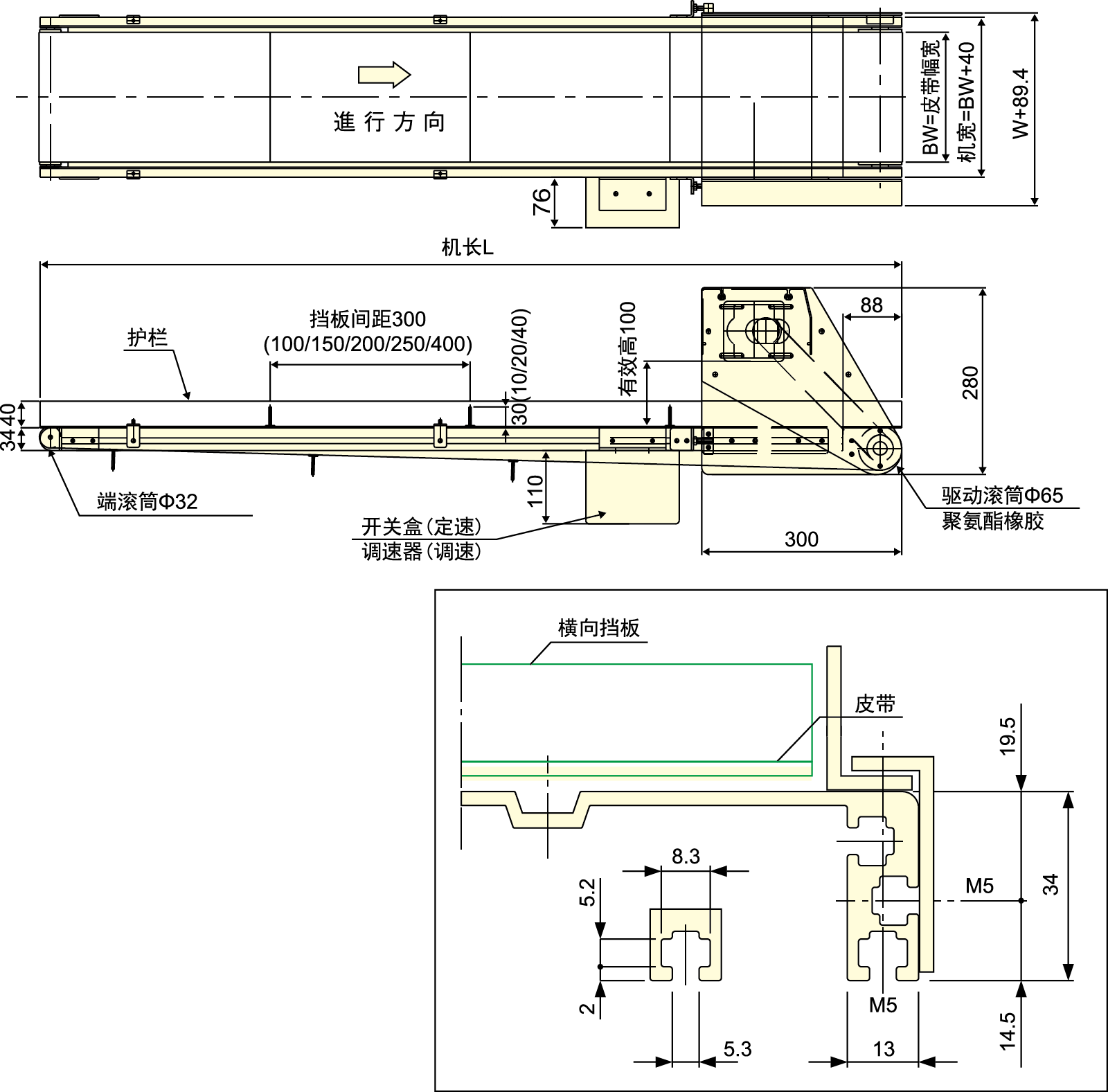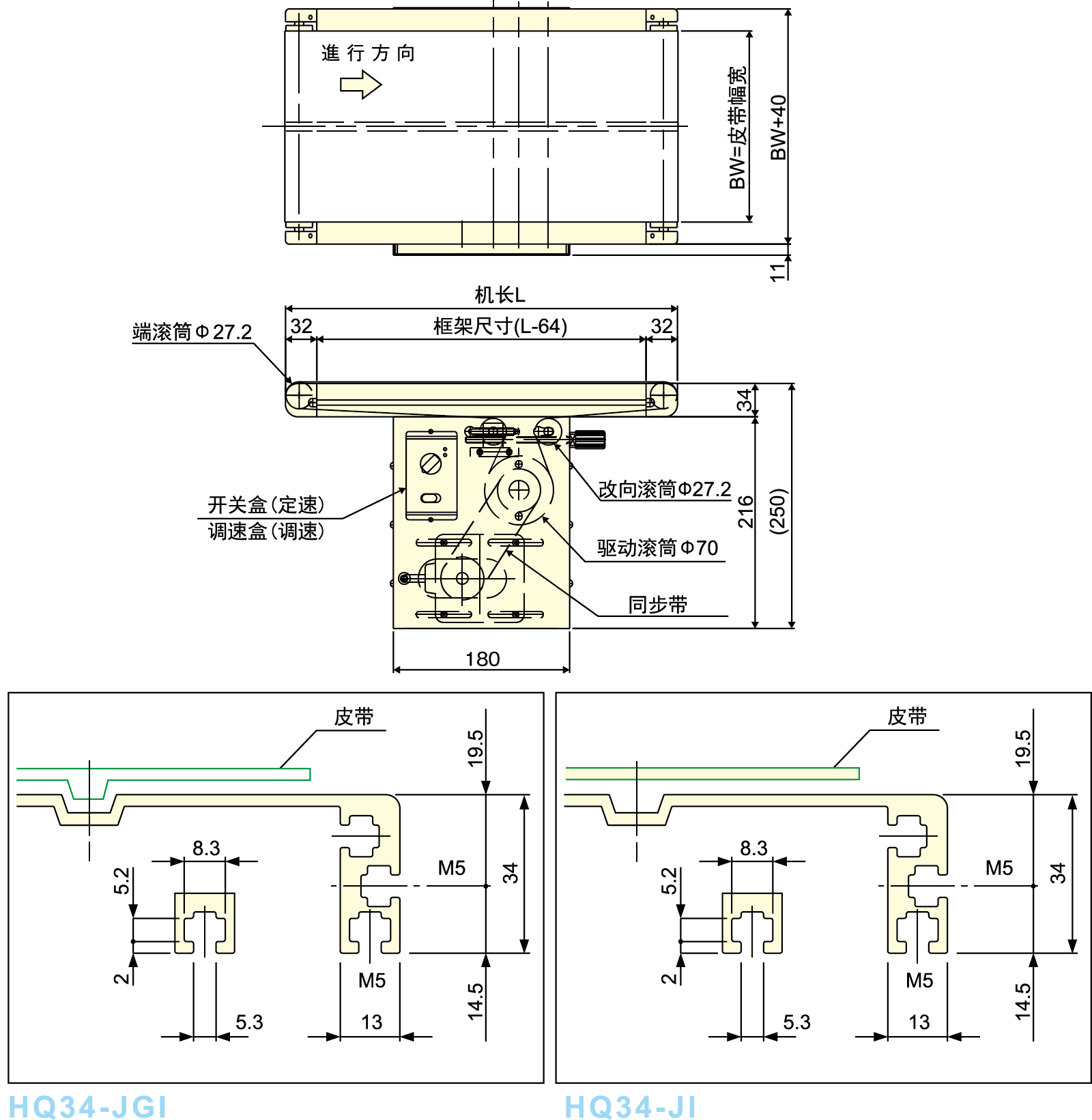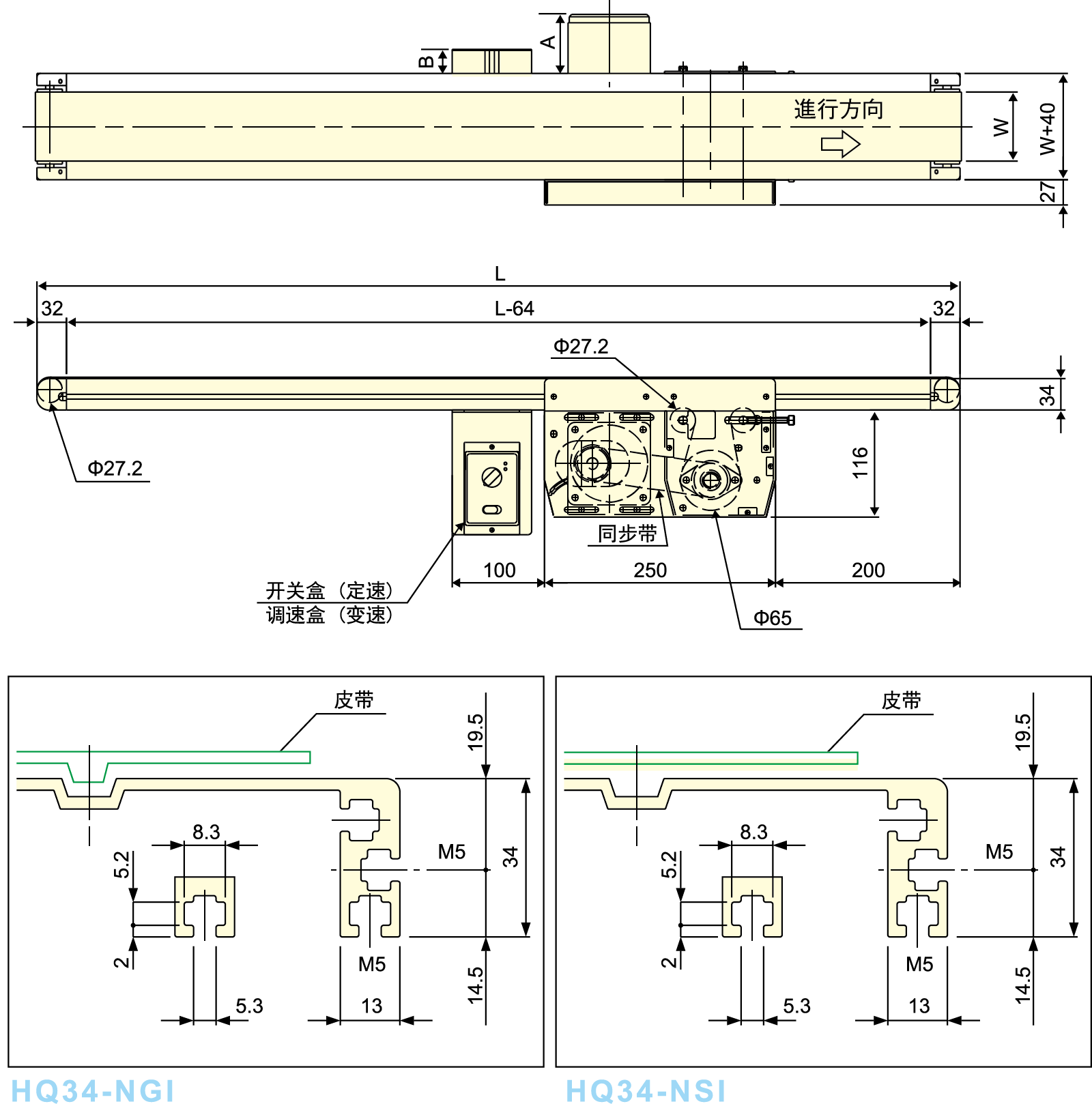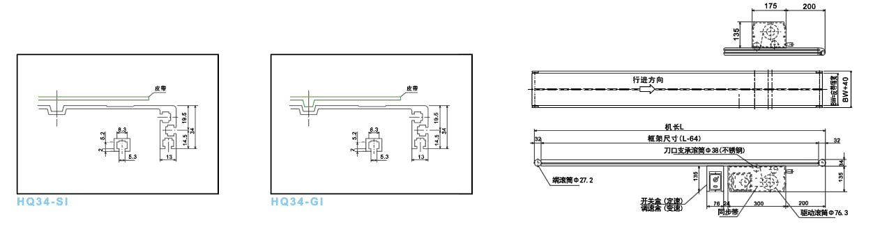 ● Tämä on tavanomainen 34 mm: n hihnikuljetin, ajokeskusta siirretään jakohihnalla.