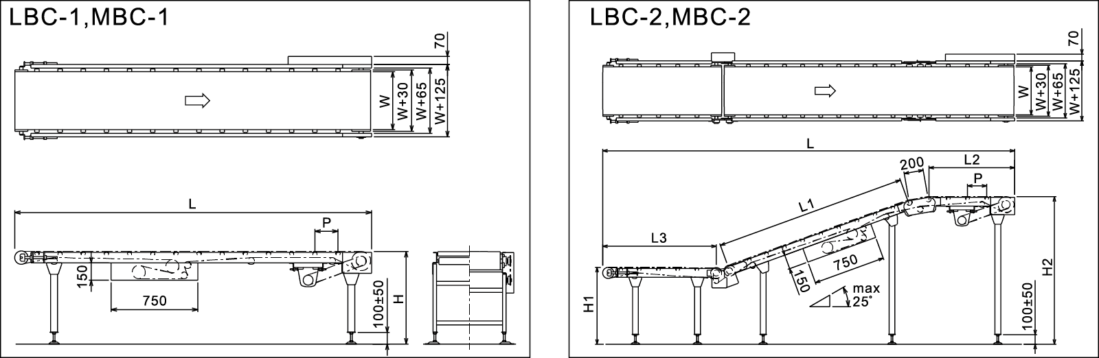 | Kuljettimen leveys | W (mm) | BW 125 | BW 125 | BW 125 | BW 125 |