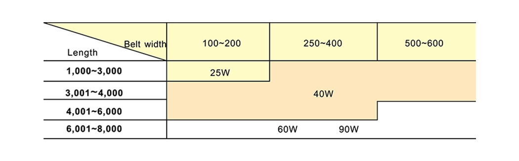 | Power \ hihnan leveys | 100 ~ 500 |