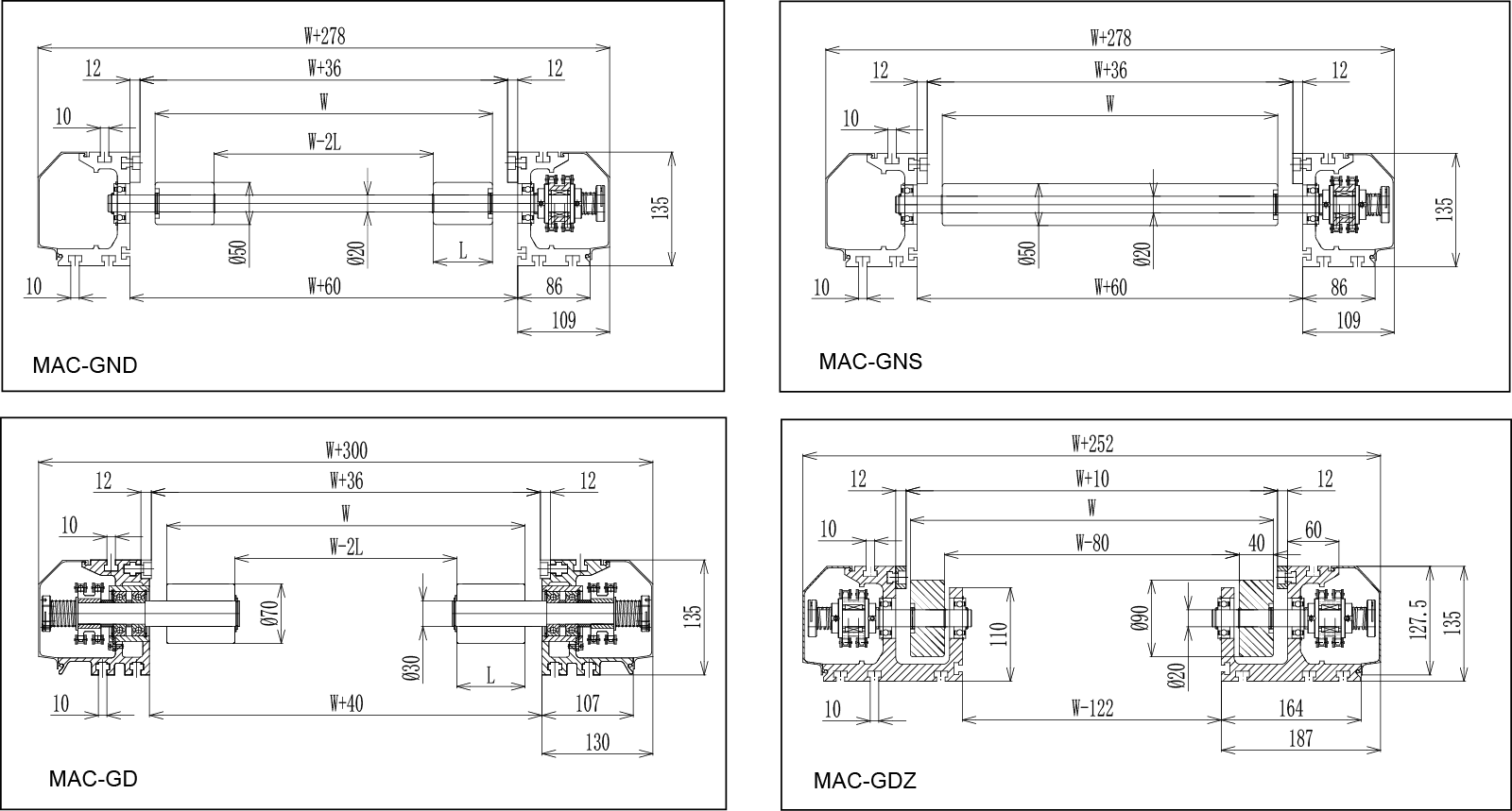 | Tyyppi | Mac-GND (jatkuva akselityyppi) | Mac-GNS (rumputyyppi) | Mac-GD (ulokeva rakenne) | Mac-GDZ (raskas tyyppi) |
